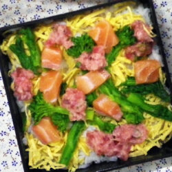 - 器に6を盛り、錦糸卵、菜の花、海鮮2種を彩りよく盛り合わせる。食べる時にお好みでしょうゆをかけていただく。 ※まぐろのたたきはスプーンなどですくい、適当な大きさにしてのせる。