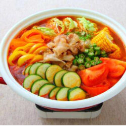 - 鍋にオクラ以外の野菜を並べ、「キムチ鍋つゆストレート」をよく振ってから入れて火にかける。
