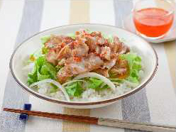 - ご飯をもり、レタスと玉ねぎをのせ、焼いた豚肉を乗せる。