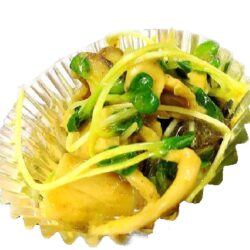 - 2に根元を切り落とした貝割れを加えて、余熱で火を通すようにかき混ぜる。