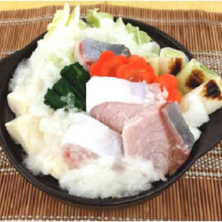 - 鍋(土鍋など)に大根おろしとだし(目安:はじめは800ml程度)を入れて加熱する。