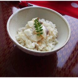 - 炊きあがったら鯛を軽くほぐしながらご飯と混ぜる。 ※骨がある場合は除く。