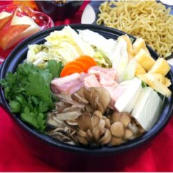 - 鍋に水、大根を入れて似る、大根が柔らかくなったら、にんじん、鶏肉を加えて、鶏肉に火が通ったら、みそ源鍋たれを加える。