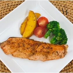 - 鮭を取り出したら、残っている油にじゃがいも加えて表面に焼き色がつくまで焼く。鮭を器に盛り、じゃがいも、ブロッコリー、ミニトマトを添える。