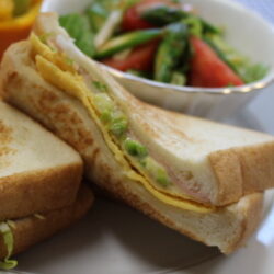 - 卵を溶きほぐす。卵焼き器を熱し、油を引いて、卵液(卵1個分)を流し入れて熱し、卵を半分に折り返して焼き、食パン1枚にちょうど良い薄焼き卵を作る。 <同様にしてもう一枚作る>