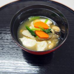 - 1 の豆腐と蒸し大豆を加え、刻んだほうれん草を散らし、一煮立ちしたら完成です。