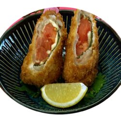 - 鍋底から約3cmの高さまで揚げ油を注ぎ、160℃に温める。③を入れ、きつね色になったら取り出し、油を切る。半分に切って、器に盛り、レモンを添える。