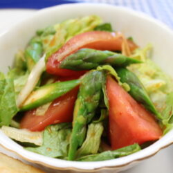 - レタスは適当な大きさにちぎる。トマトは食べやすい大きさに切る。アスパラガスは塩を加えた熱湯で色よくゆで、食べやくい大きさに切る。新たまねぎは薄くスライスして水にさらしてからしっかりと水けを除く。