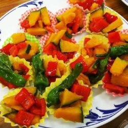 - パプリカはかぼちゃの大きさに合わせて切る。 ししとうは爪楊枝で穴を開ける。