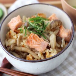 - 炊飯器に 1 の米を入れ、Bを加えて2合目の目盛まで水を注ぎ入れ、 2 の鮭・ぶなしめじをのせて炊く。