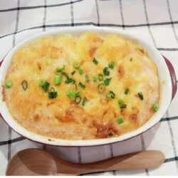 - チーズと粉チーズをまんべんなくかけ、オーブントースターで焦げ目がつくまで15分ほど焼く。仕上げに小口ネギを散らして完成。