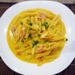 - 沸騰させないように3を弱火にし、ペンネを入れ、良く絡ませる。味をみて塩とブラックペッパーを加える