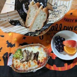 - グラタン皿にバターを塗り、ミートソース・きのこ・チーズ・すりおろした長芋をのせ、上にえりんぎのかさをスライスしたものをのせる。
