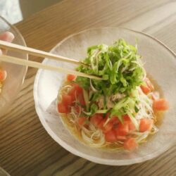 - 器にそうめん、ツナ、トマト、大葉、きゅうりをのせ、めんつゆを薄めずにかける。