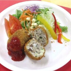 - 小麦粉、卵、パン粉とつけて、170度の油であげてできあがり。