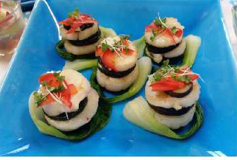 - 皿に帆立となす、ズッキーニを交互にのせ、かいわれ大根とパプリカの薄切りを飾り、ゆでたチンゲン菜を巻き、ソースを上から掛けて完成。