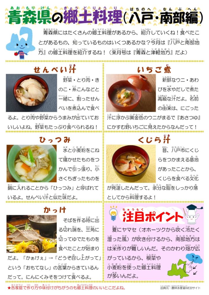 同じ青森県でも地域によっていろいろな料理があるよ。給食で出てくる料理もあるかもしれないね!