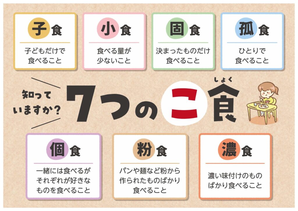 みんなで楽しく食べる「共食」のメリットや「7つのこ食」について、わかりやすく図にしてみました。