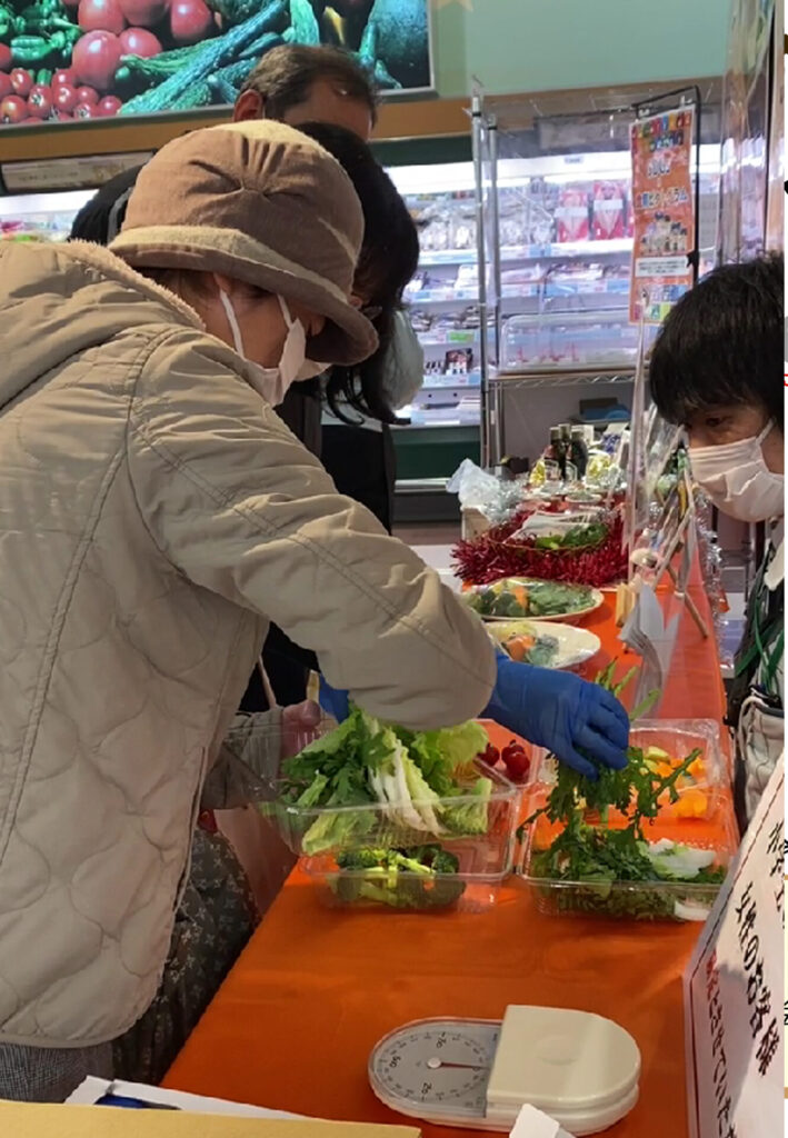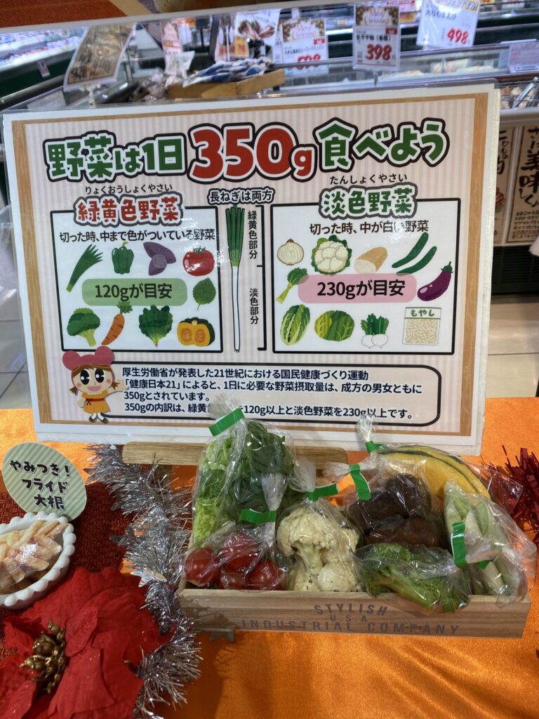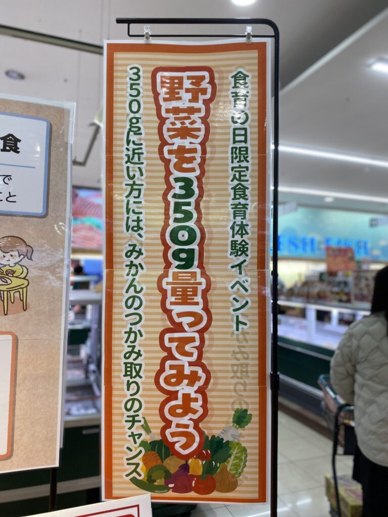 またイベントとして、野菜を1日に350g以上食べることの大切さを知ってもらう「野菜を350g量ってみよう」の実施、