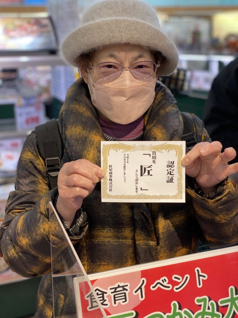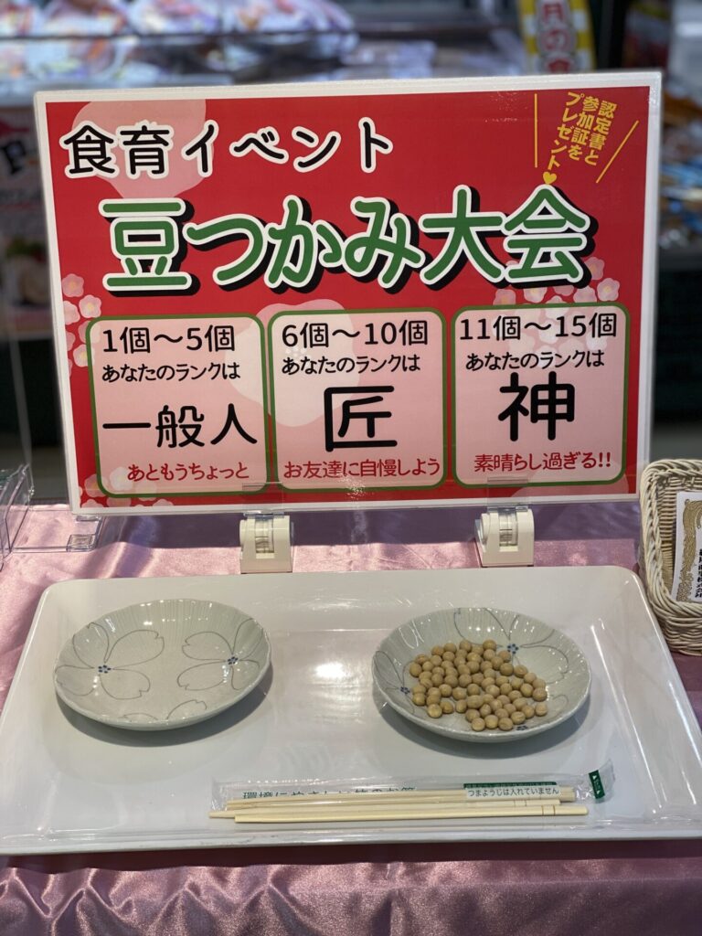 食育イベントは、来月の行事の節分にちなんで、大豆を使って「豆つかみ大会」を実施しました。
