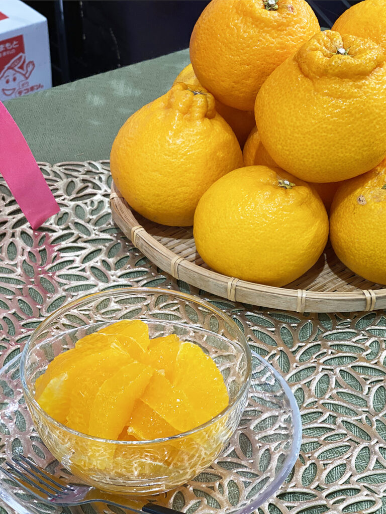 門田さんの不知火デコポンをデザートに、「さぁ!ひな祭りパーティの始まり始まり!」