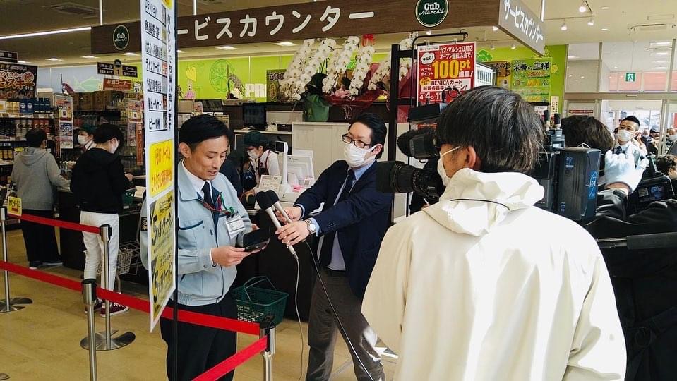 テレビ局にインタビューされる吉田将人店長(左端)