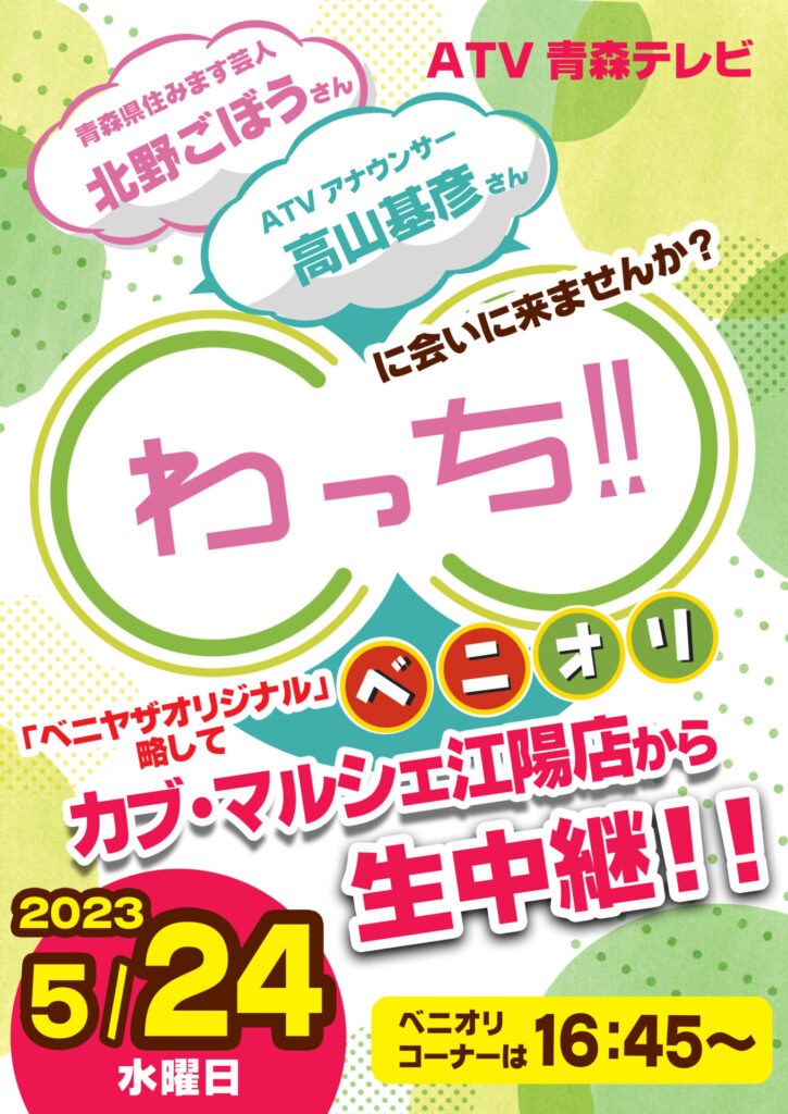 2023年5月24日(水)のATVわっち!!中継は八戸市のカブ・マルシェ江陽店からお届けします。 お楽しみに!