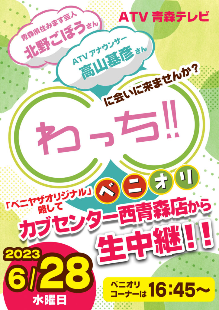 2023年6月28日(水)のATVわっち!!中継は青森市のカブセンター西青森店からお届けします。 お楽しみに!