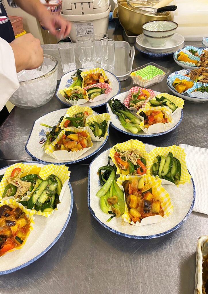 講師の徳永ひろみ先生が大阪市で実施されている料理教室の中でも人気のある夏野菜レシピを10品作りました。
