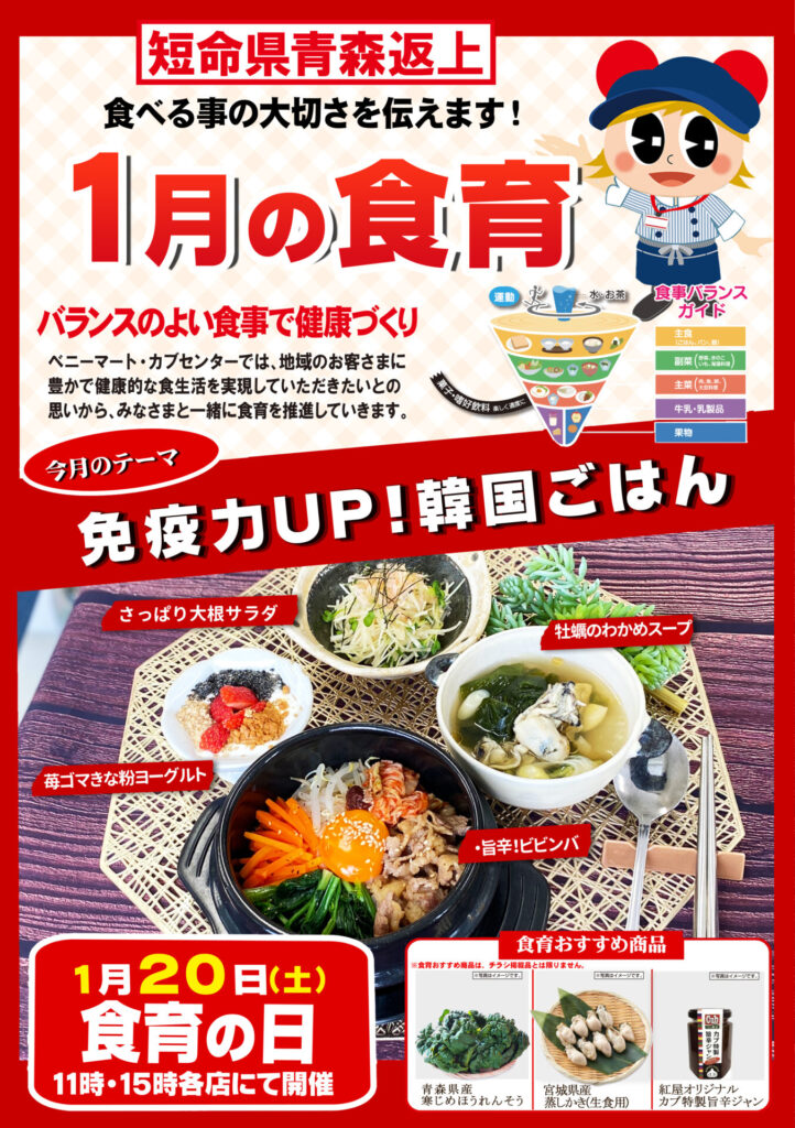 1月の食育の日は1月20日(土)に開催いたします。テーマは『免疫力UP!韓国ごはん』 免疫力をアップさせる方法をお伝えします!