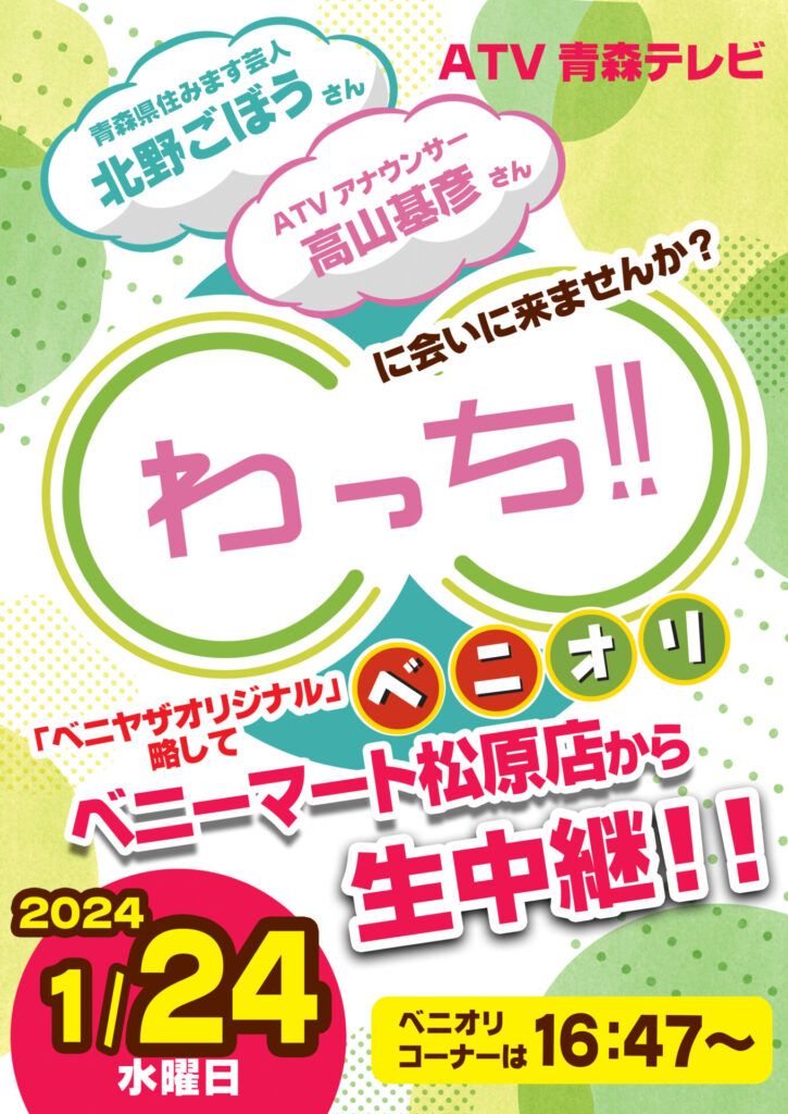 2024年1月24日(水)のATVわっち!!は弘前市のベニーマート松原店から中継します!