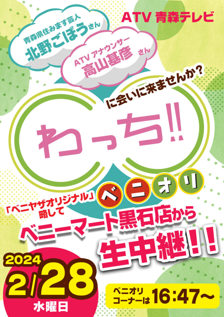2024年2月28日(水)のATVわっち!!は黒石市の ベニーマート黒石店から中継いたします!