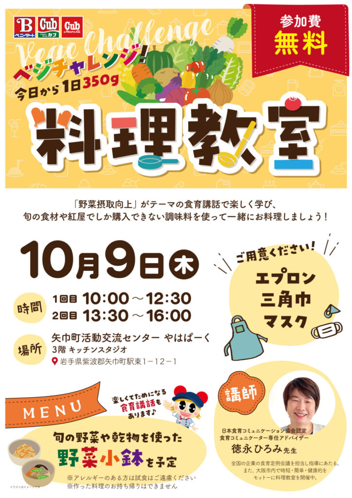 10月9日(木)岩手県の矢巾町活動交流センターやはパークにて岩手県で初の料理教室を開催!🥗🍅🎃