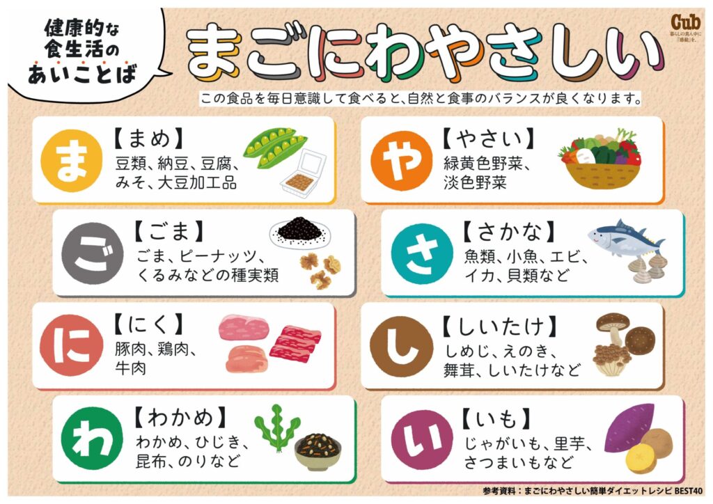 「まごにわやさしい」という言葉は、食材の8つの頭文字で出来ています。