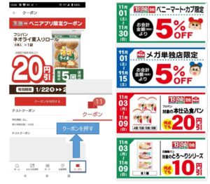 ベニアプリ下のメニューボタン「クーポン」を押していただくと、ベニアプリを利用してお買い物する際に利用できるクーポンがご案内されます。カブセンターまたはベニーマートで月2回、メガで月1回は5%引きクーポン等が使えます。